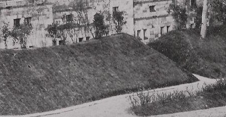 Derriére le puits, l'oeil du promeneur est irrémédiablement attiré par une butte massive qui cache de moitié la vision vers le bâtiment. Son but est simple et est purement technique militaire :