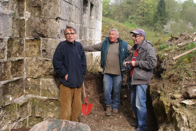 Le dégagement du pied du bâtiment fut continué, le tout à la pelle et la brouette. 3 métres ont ainsi pu être réalisé. Encore quelques séances dans ce sens et l'ensemble sera terminé.